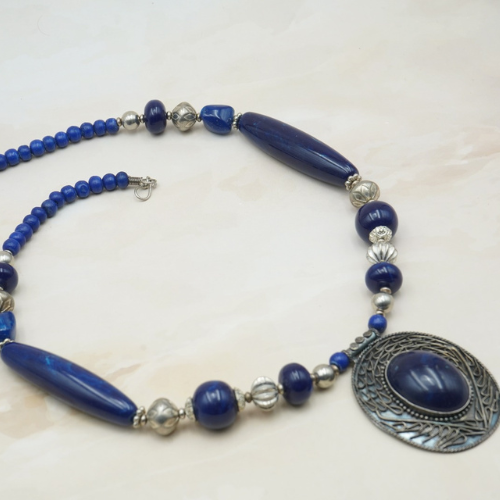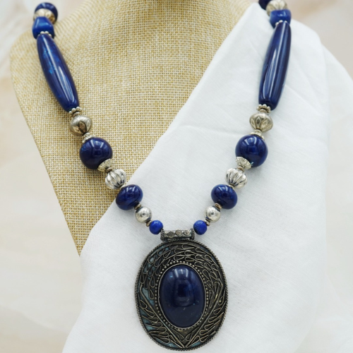 A blue sapphire semi-precious stone necklace with oxidized silver pendant.